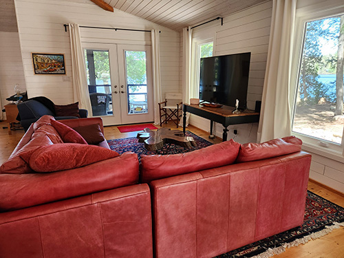 There are two living room areas; one near the wood stove overlooking the lake and one near the 65” TV.